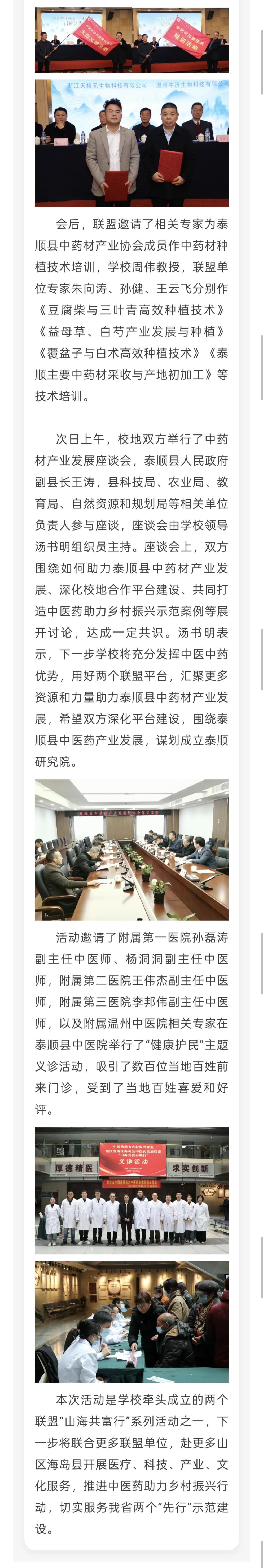 校地双方共同发布了泰顺第一批最受百姓喜爱的20道药膳;启动了《泰顺药膳》书籍编撰工作,王涛代表县人民政府聘任周伟教授和夏明副教授为书籍主编;启动了义诊活动和中药材种植技术培训活动,汤书明代表学校为两项活动授旗;举行了多项学校泰顺技术转移中心联系和服务的产业发展合作签约,校友企业浙江天植元生物科技有限公司与当地企业温州中济生物科技有限公司签约共建中药材活性物质提取生产线。