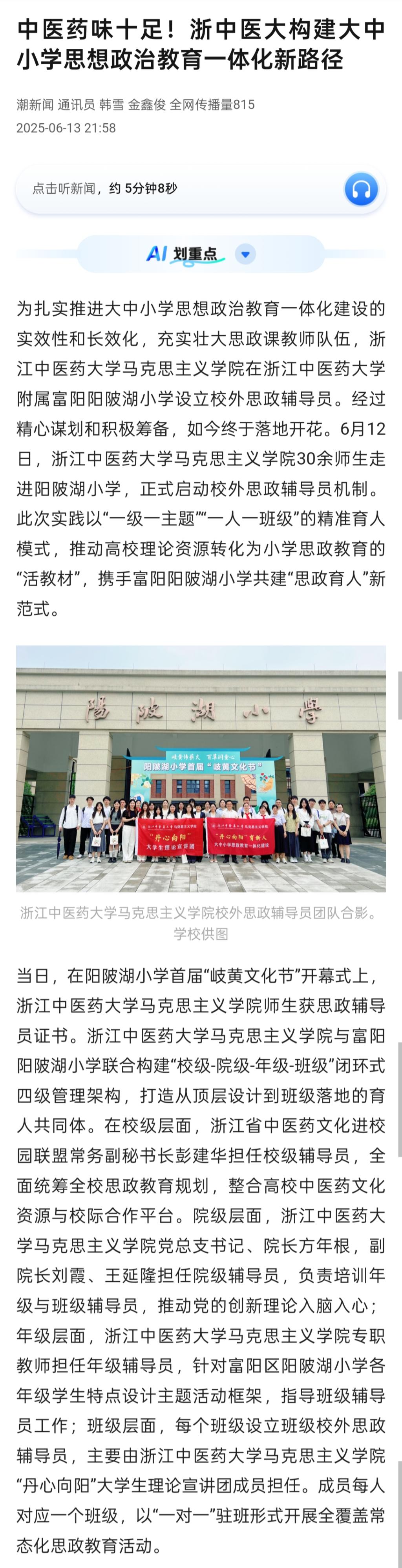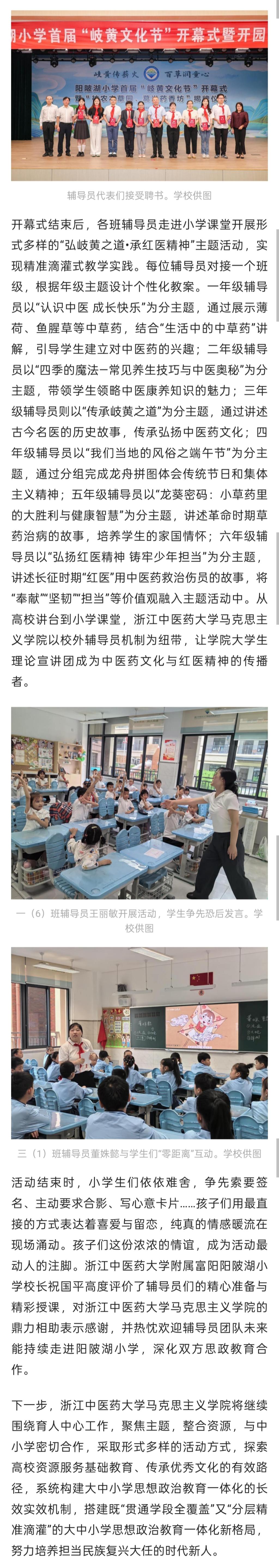 潮新闻、杭州新闻:中医药味十足!浙中医大构建大中小学思想政治教育一体化新路径